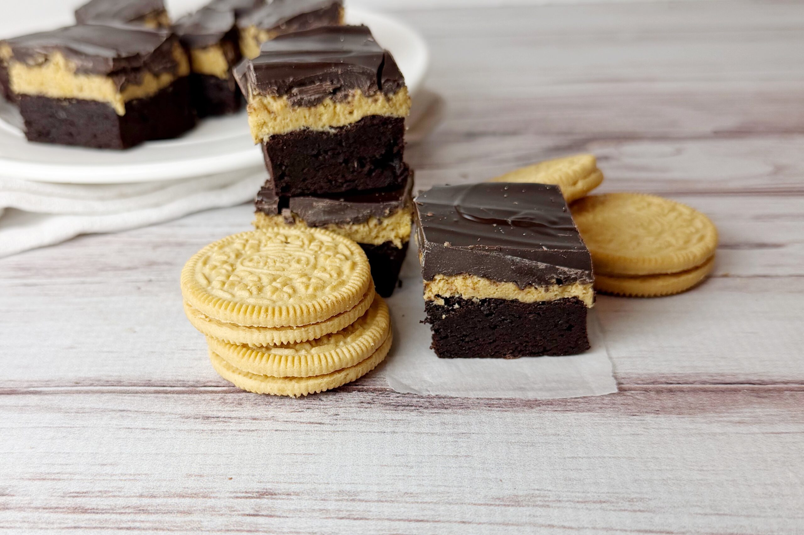 There’s a million and one Dubai Chocolate Brownie recipes out there, but mine is different and easier to make. A thick, fudgy brownie bottom, layered with a mix of pistachio cream and crushed Golden Oreo’s and then topped with a thin layer of melted semi sweet chocolate chips.