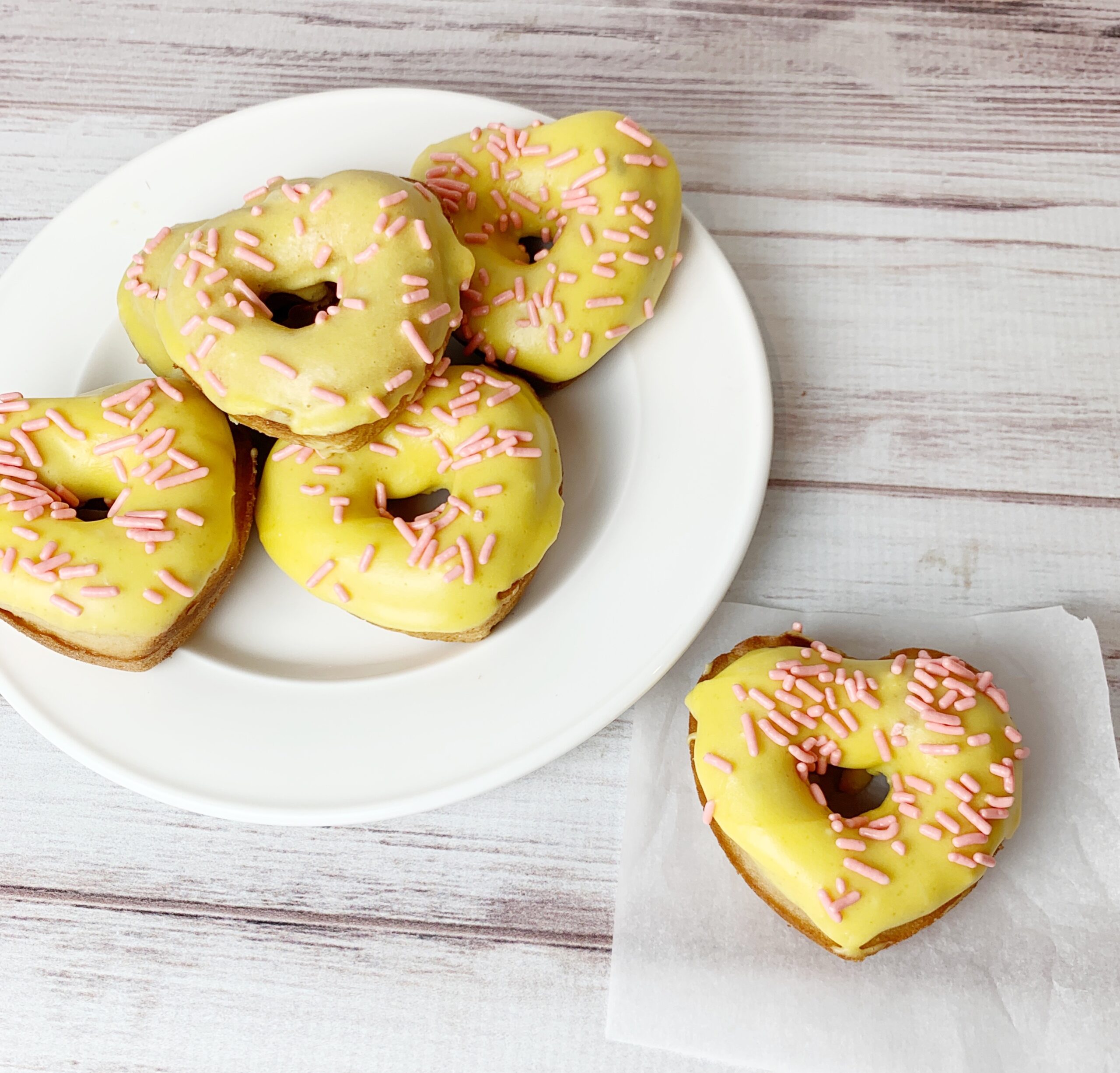 Homemade donuts are so easy to make and only require one bowl and a donut baking pan. I have a regular circle donut pan, but also a heart shaped donut pan. I thought since I was flavoring these donuts with passion fruit, it was the perfect time to use my heart pan.